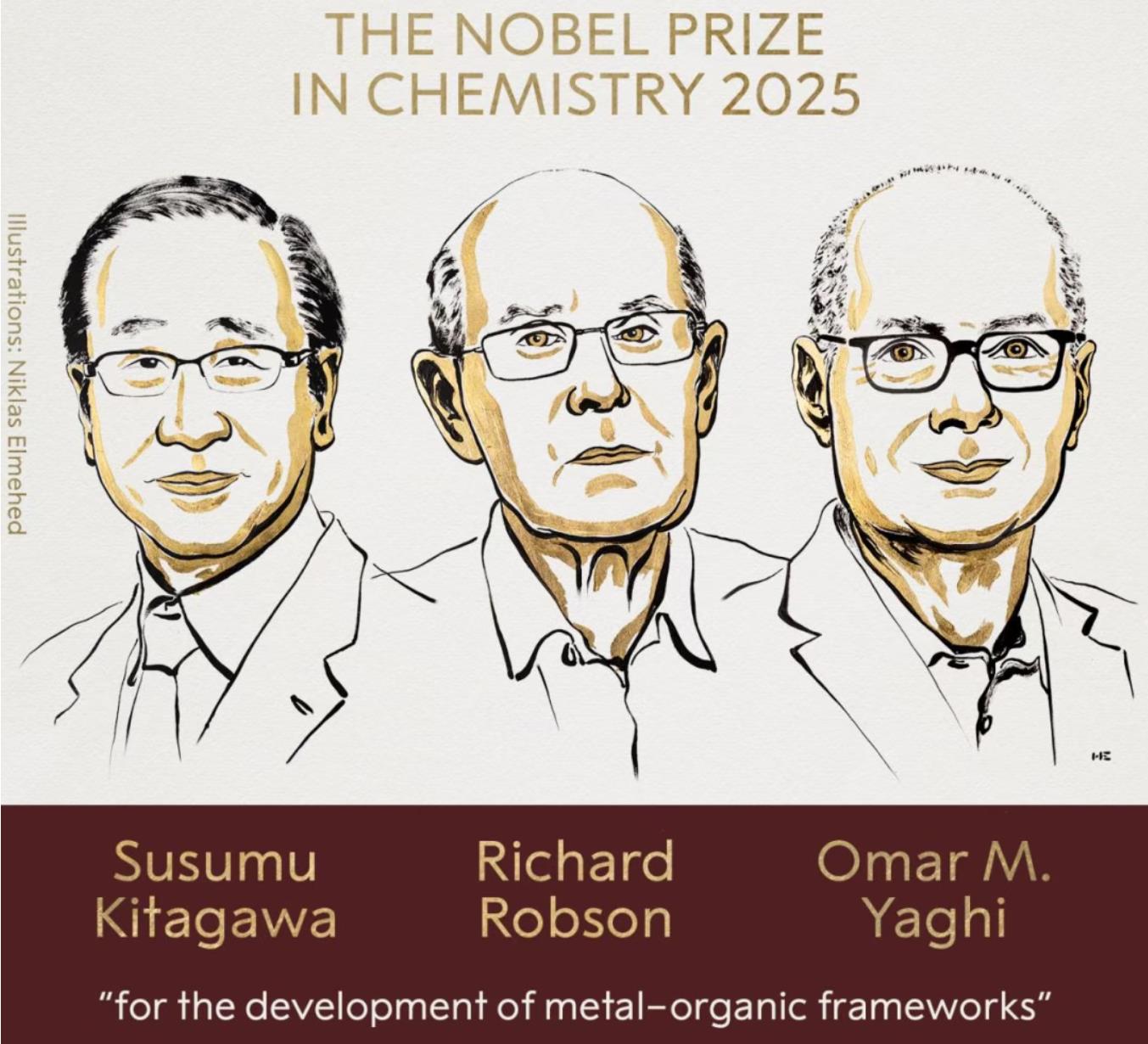 2025 年 10 月 7 日,瑞典皇家科学院宣布,将诺贝尔化学奖授予日本京都大学的北川进、澳大利亚墨尔本大学的理查德・罗布森与美国加州大学伯克利分校的奥马尔・亚吉。颁奖词用 “为化学创造新空间” 精准概括了他们的贡献 —— 三人联手开创的金属有机框架(MOF) 材料,如同在纳米世界搭建起千万座 “分子宫殿”,既能从沙漠空气中抓水,又能从工厂废气中捕碳,正成为应对全球资源危机的关键武器。