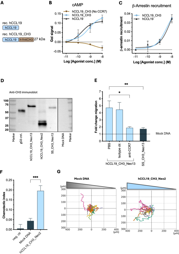 方法细节:首先通过生物发光共振能量转移(BRET)实验,在转染人CCR7的HEK293细胞中,检测重组hCCL19_CH3蛋白对Gαi信号和β-arrestin招募的激活作用,设置不同浓度梯度并计算半数最大效应浓度(EC50);随后通过Boyden小室趋化实验和三维胶原基质趋化实验,评估HEK293T细胞分泌的hCCL19_CH3_Neo13、hCCL19_CH3_Neo2等融合蛋白对人moDCs的趋化能力,同时使用抗CCR7阻断抗体验证趋化作用的特异性;通过免疫印迹和ELISA检测融合蛋白的表达量和分子质量。