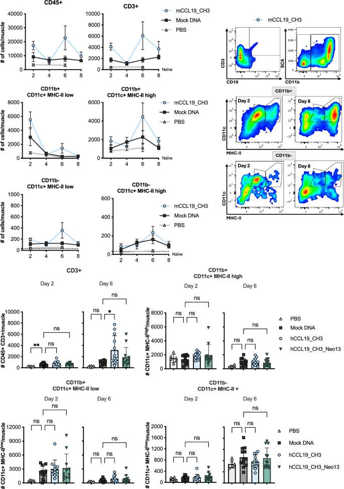方法细节:给BALB/c小鼠肌肉注射编码小鼠CCL19的DNA构建体(mCCL19_CH3、mCCL19_CH3_Neo13),在免疫后2、4、6、8天收集接种部位的肌肉组织,制备单细胞悬液,通过流式细胞术检测CD45+免疫细胞、CD3+T细胞、CD11c+MHC-II+树突状细胞(DCs)的数量变化,同时分析DCs的成熟状态(MHC-II表达水平)。
