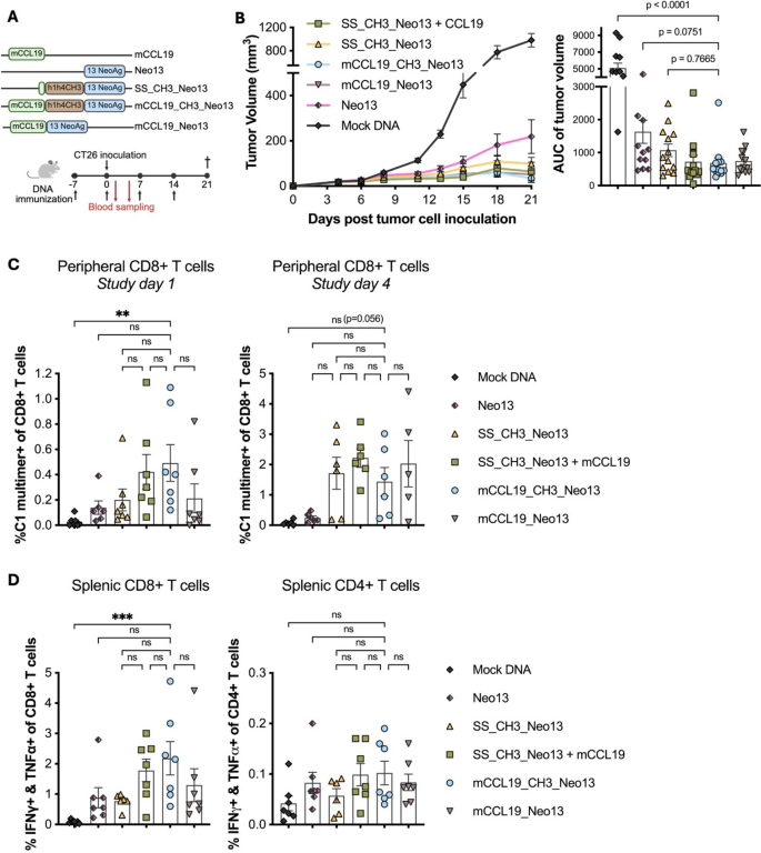 实验目的:比较不同DNA构建体(含/不含CCL19、分泌信号、二聚化结构域)在CT26同源肿瘤模型中的免疫原性和抗肿瘤效力,明确CCL19作为靶向单元的作用。