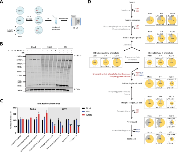 方法细节:将HeLa WT细胞分为mock、IFN刺激、ISG化机器表达三组,诱导ISG化后更换为含¹³C₆-葡萄糖的培养基培养24h;提取细胞内代谢物,采用LC-MS技术检测糖酵解中间产物的相对丰度及¹³C同位素标记比例,通过TraVisPies工具整合分析代谢物丰度与标记数据。