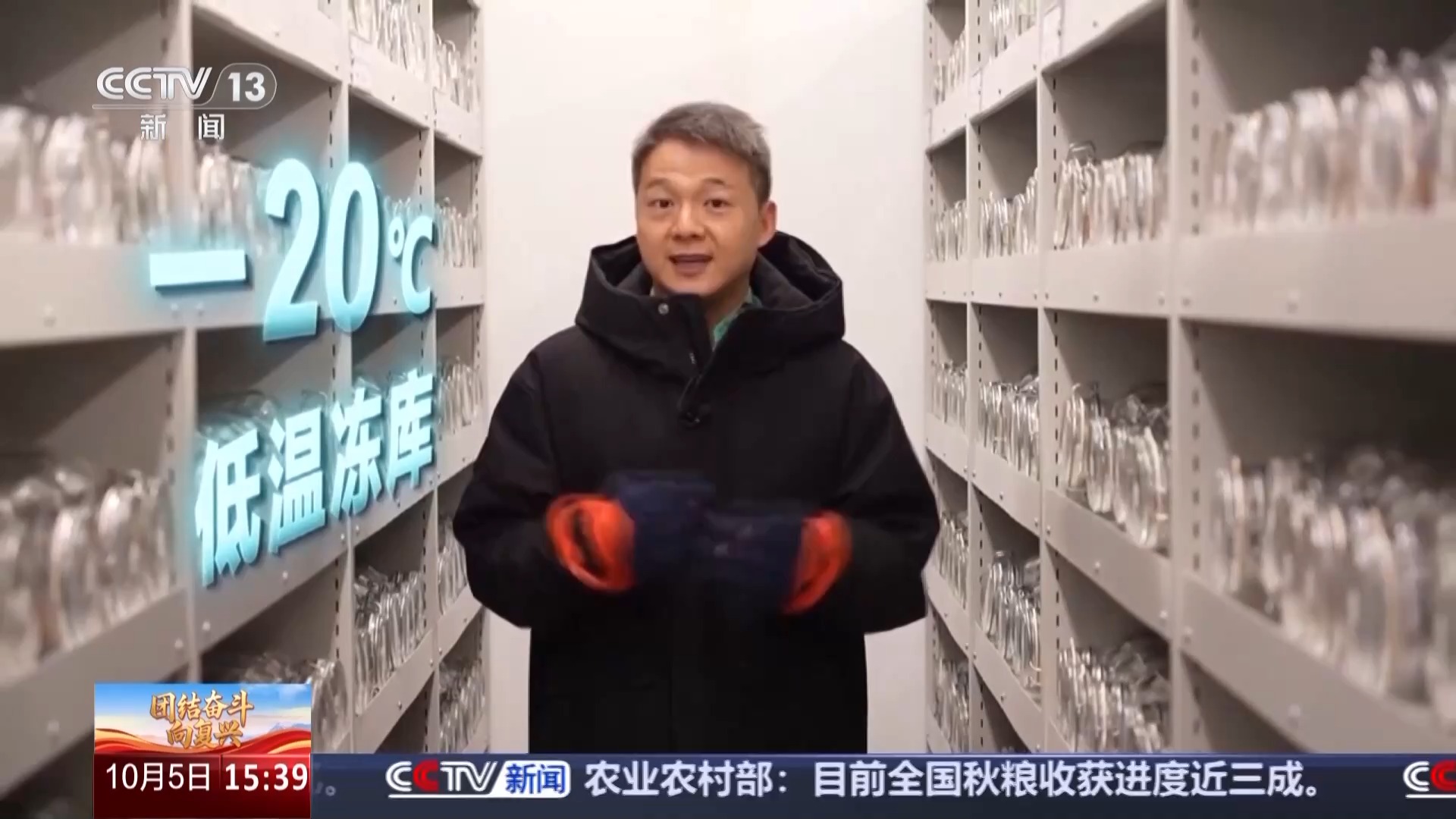 总台央视记者帅俊全:穿着厚厚的羽绒服,现在我们就进入了零下20℃的低温冻库,这里也是亚洲最大的野生生物种质资源的一个保存库。别看这个屋子只有40平方米左右,但是它非常重要,因为在其他4个活动库保存的珍贵的种子在这个屋子里面都有所备份,所以它就好像是一个长期保存的“诺亚方舟”。这里面保存有很多珍贵的种子,比如说这一瓶里面保存的是我们科研人员从珠峰海拔6200多米的高处采集回来的须弥扇叶芥的种子就在这里面,然后还有从蒙自天坑采集回来的大花石蝴蝶的珍贵的种子,在这里都有备份。那么迄今为止,我们科研人员是一共采集保存了大概1.2万种10万份,也就是占到了我们国家1/3左右的这样一个野生植物的种质资源。
