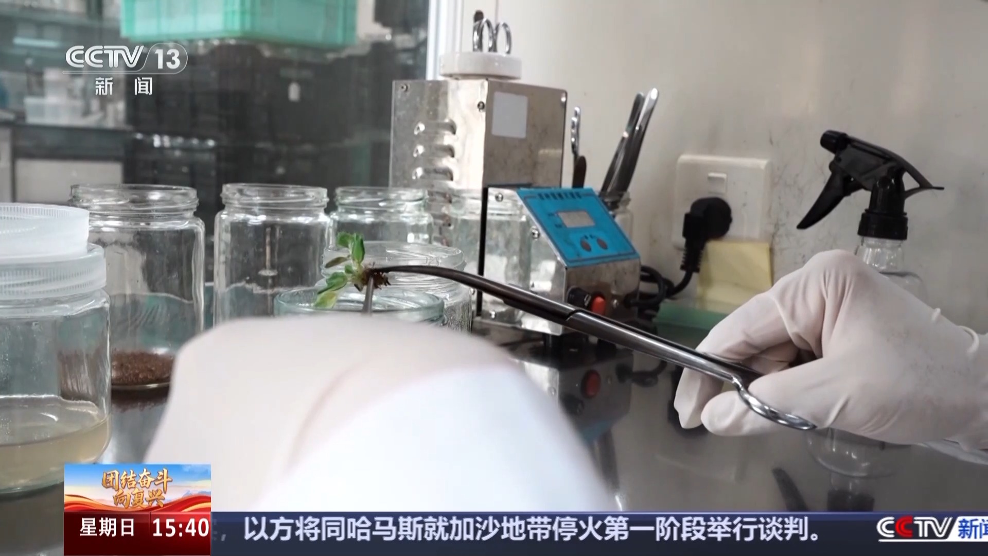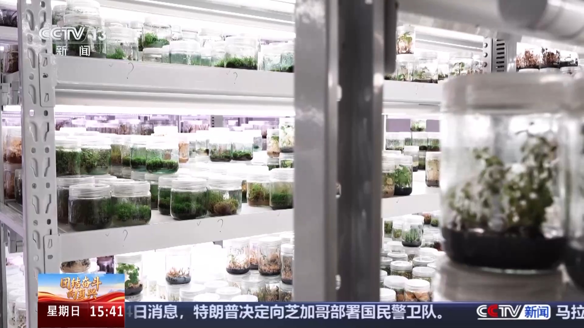 演播室里我们现在看到的是几件非常珍贵的种质资源,这些是在青藏高原采集的果实和种子,这株植物就是刚刚看到的极危物种大花石蝴蝶,它是科考团队通过离体培养繁育的。