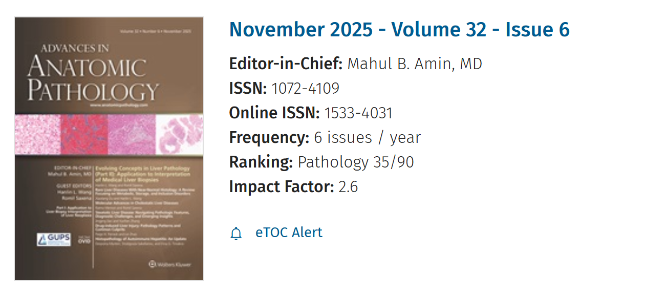 《Advances in Anatomic Pathology》(简称AAP)由Wolters Kluwer Health旗下Lippincott Williams & Wilkins(LWW)出版社主办,创刊于1994年,核心定位为「解剖病理学领域转化研究与临床实践的桥梁期刊」。其收稿特色显著:优先发表整合形态学、分子技术与临床结局的创新性研究,特别关注数字病理标准化、新型生物标志物验证、罕见病病理分型修订等方向;同时接受高质量综述(占比约30%),但明确拒收纯技术描述性研究(如未结合临床样本的AI算法开发)和单纯病例报告(需升级为小系列病例分析并含机制探讨)。该期刊2023-2024年发文量约450篇,非Mega Journal,适合中高创新性的细分领域进展研究投稿。