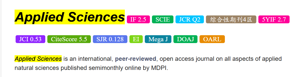 《Applied Sciences (Basel)》(ISSN: 2076-3417)由瑞士MDPI(Multidisciplinary Digital Publishing Institute)于2011年创办,是应用科学领域的综合性开放获取期刊。其核心定位为"桥梁型应用研究平台",特色在于接收工程技术与自然科学交叉学科成果,尤其鼓励具有明确应用前景的技术验证类研究(Technology Readiness Level 3-6)。作为典型的Mega Journal,该刊2023年发文量达5827篇,位列工程技术类期刊前3%^2024 JCR Clarivate^。