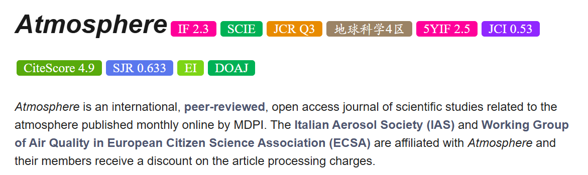 - 期刊最新影响因子预测:[MDPI Journal Metrics](https://www.mdpi.com/journal/atmosphere/metrics)